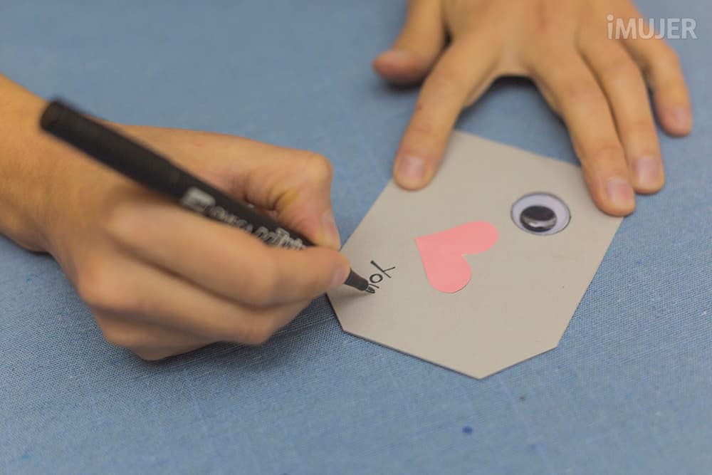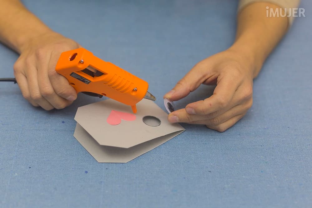 Pega el corazón en el medio de la tapa de la tarjeta y el ojo en la base de la tarjeta.