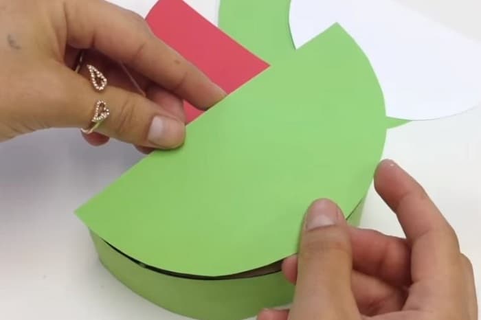 11. Haz dos medios círculos en el papel verde y pégalos para cubrir los lados del molde de cartón.