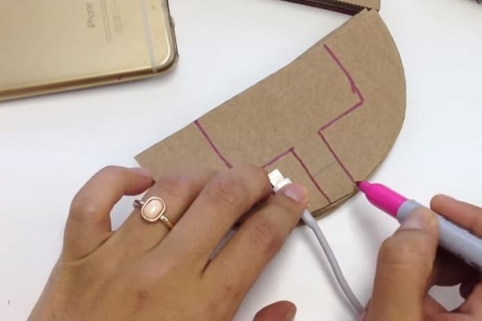 3. Dibuja en tres de los medios círculos la parte de debajo de tu celular (hasta dónde quieres que entre) y también un pedazo del cable para cargarlo.