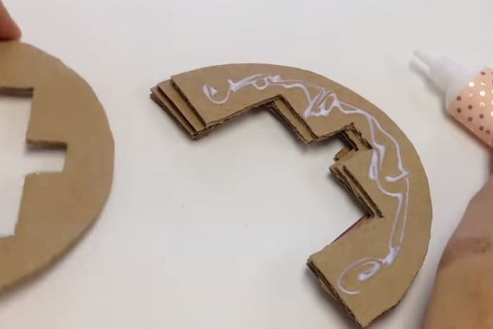 7. Pegas los tres primeros medios círculos que cortaste. Posteriormente pega 3 medios círculos completos y finalmente los 3 medios círculos a los que recortaste la entrada para cable.