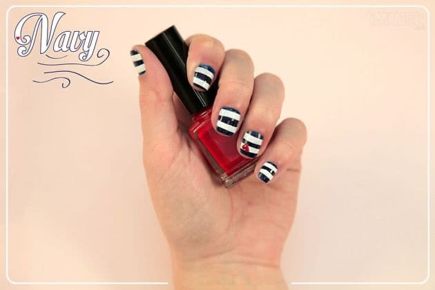 ¡Lleva la moda a tus uñas! El estilo navy o marinero que combina azul, blanco y rojo, y las rayas también, es una tendencia de la moda que queda preciosa en las uñas.