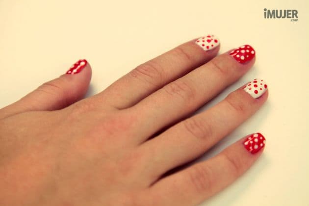 Me encanta este decorado de uñas con lunares al estilo Minnie Mouse. Es muy divertido y fácil de hacer: ¡solo necesitas pulso para que los lunares queden prolijos!