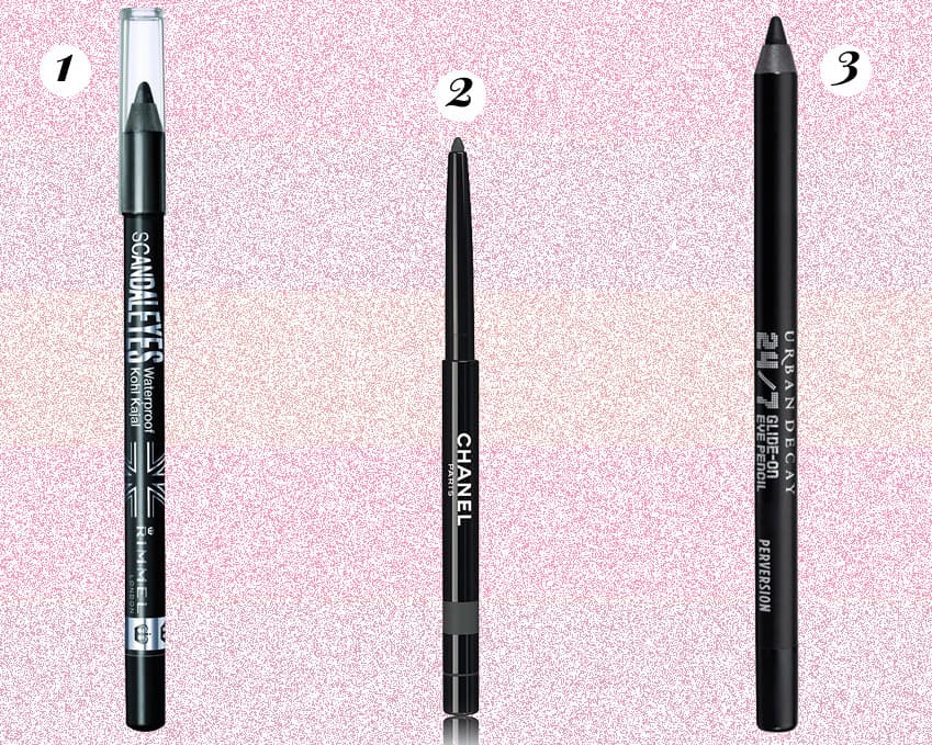 (1. Scandaleyes Waterproof Kohl Kajal de Rimmel London 2. Stylo Yeux Waterproof Long-Lasting Eyeliner de Chanel 3. 24/7 Glide-On Eye Pencil de Urban Decay)