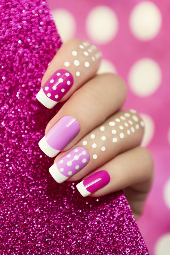 #4 Manicura francesa con esmalte rosa, fucsia y lunares