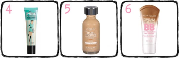 (POREfessional face primer de Benefit + True Match Super-Blendable Makeup de L’Oreal + Dream Fresh BB Cream de Maybelline)