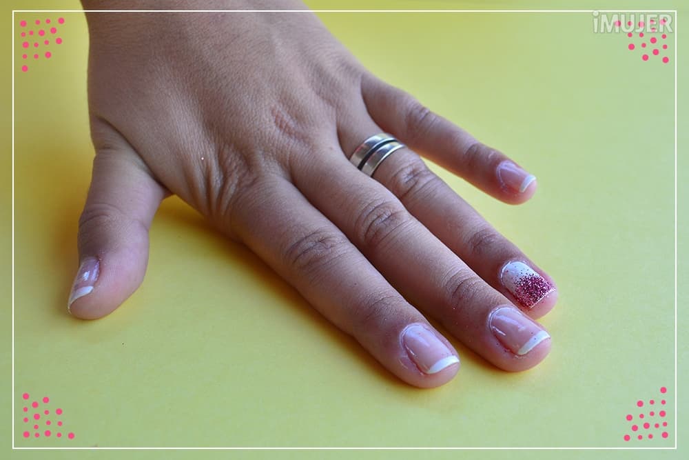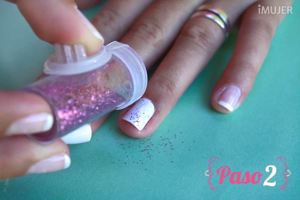 Antes de que se seque el esmalte, vierte algo de purpurina rosa sobre el borde superior de tu uña, tal como lo muestra la imagen y, ¡listo!