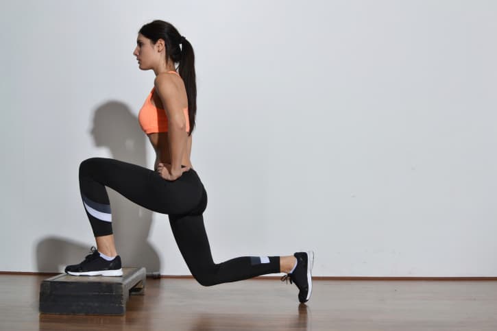 Párate con las dos piernas separadas en paralelo a la altura de las caderas. Da un paso hacia adelante bajando lentamente el cuerpo y flexionando ambas rodillas. La flexión debe ser de 90 grados y la rodilla de la pierna que esté adelante debe estar a la misma altura del tobillo. Haz 3 series de 15 repeticiones y luego repite con la otra pierna de frente.