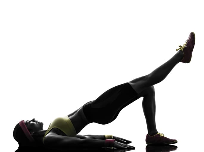 Acuéstate boca arriba con las rodillas dobladas y los pies apoyados en el suelo. Eleva poco a poco tu espalda haciendo fuerza con los glúteos, la parte posterior de los muslos y los abdominales, hasta que se forme una línea diagonal entre las rodillas y los hombros. Haz 3 series de 20 repeticiones.