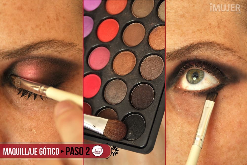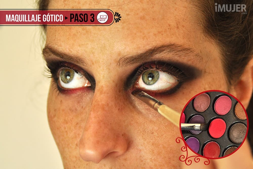 Cubre tu párpado inferior con la misma sombra negra hasta llegar el centro del ojo. Lo que sigue es sencillo. Deberás aplicar sombra roja desde el centro del parpado inferior hasta el lagrimal.