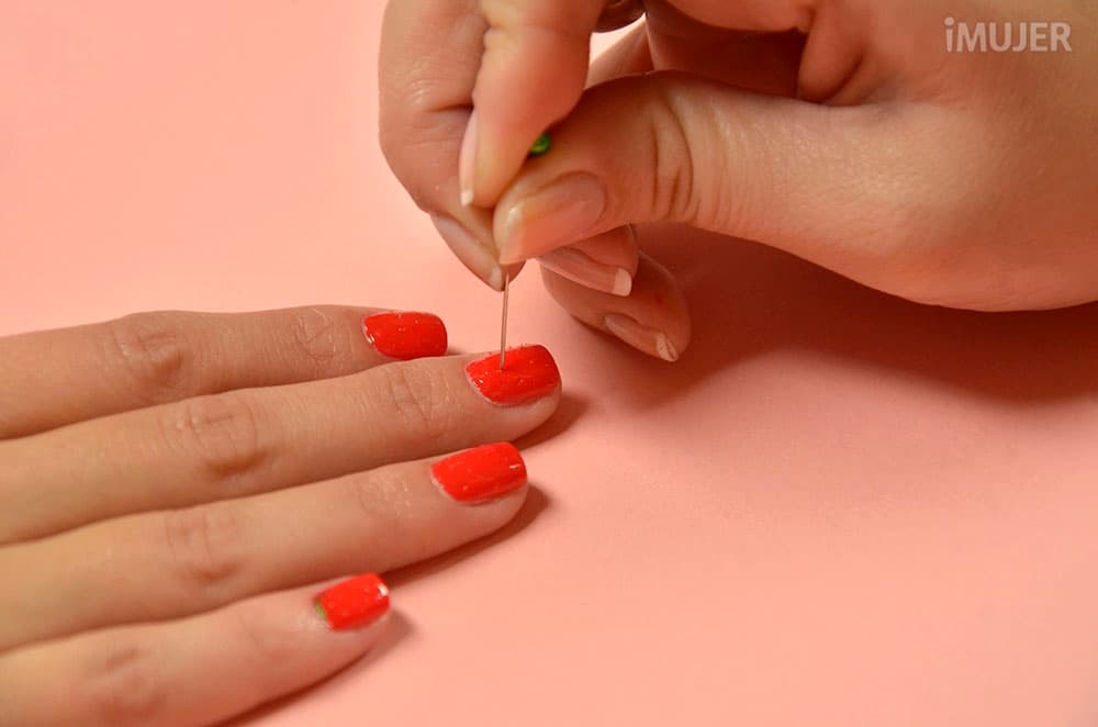 Aguarda a que se sequen y, luego, con la ayuda del alfiler pincha el esmalte. De esta manera, lograrás recrear mejor el aspecto de la frutilla.