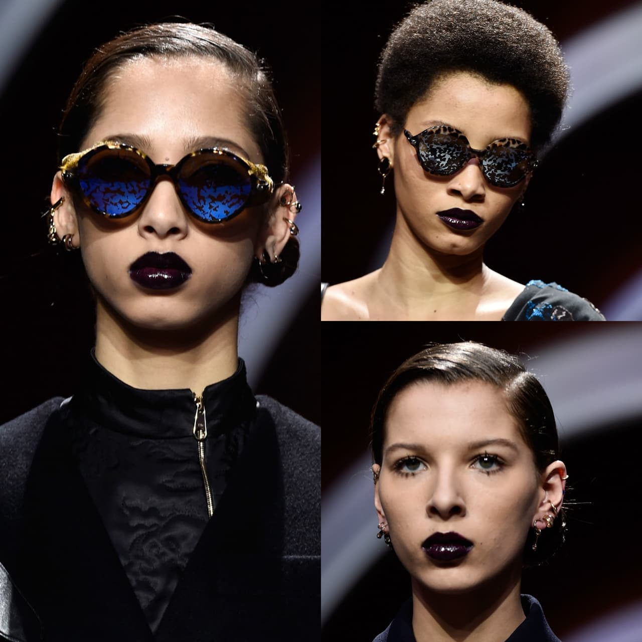 Los labios en tono malva obscuro e intenso con efecto brillante fueron el foco principal en el look de Dior.