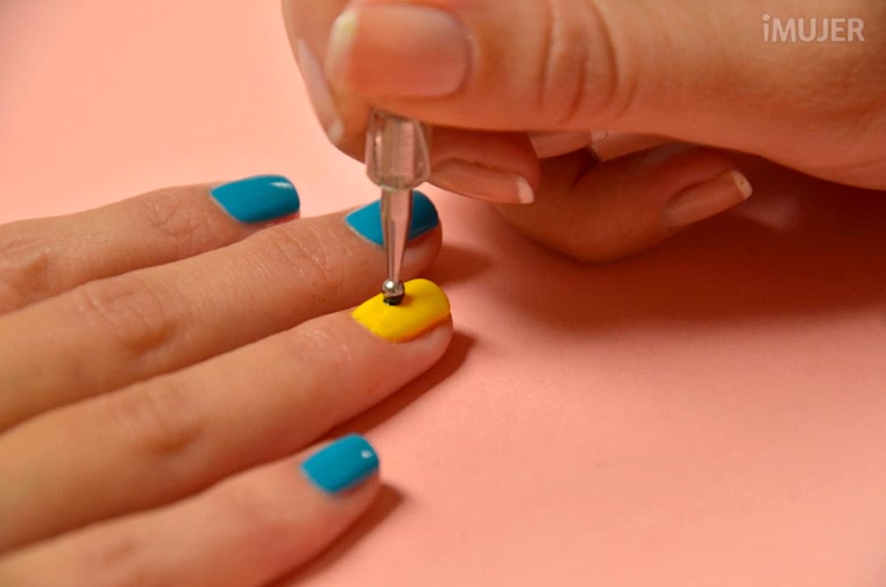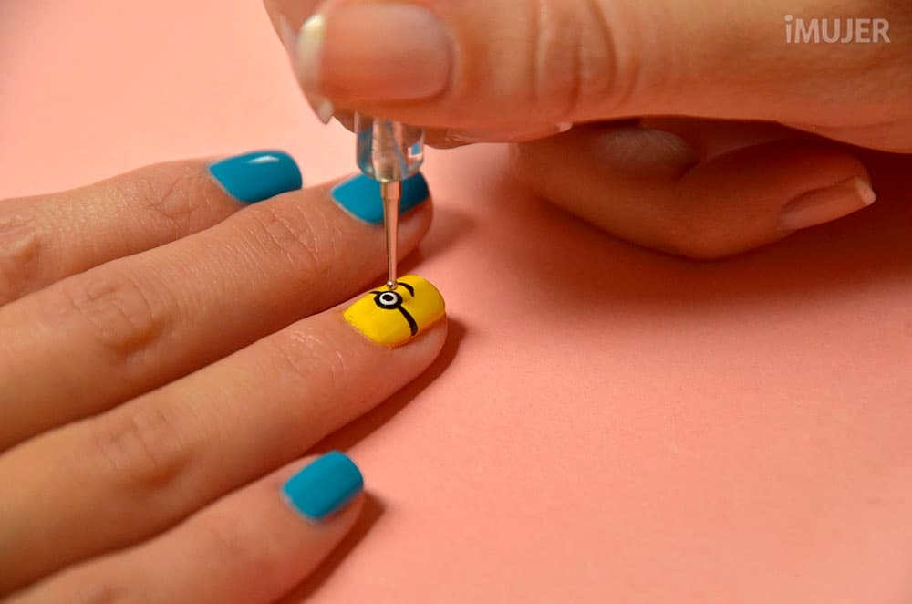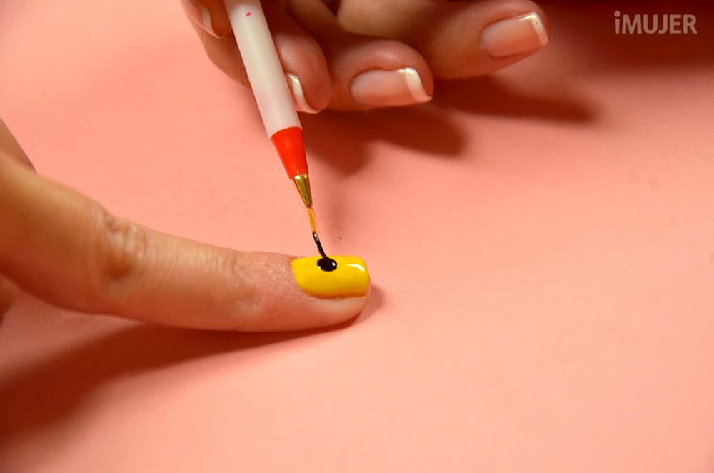 Con el punzón, dibuja un punto negro sobre las uñas amarillas.