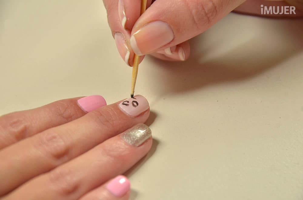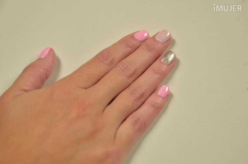 A continuación, tendrás que ocuparte de las dos uñas que dejaste sin pintar. Embellécelas con el rosa suave.
