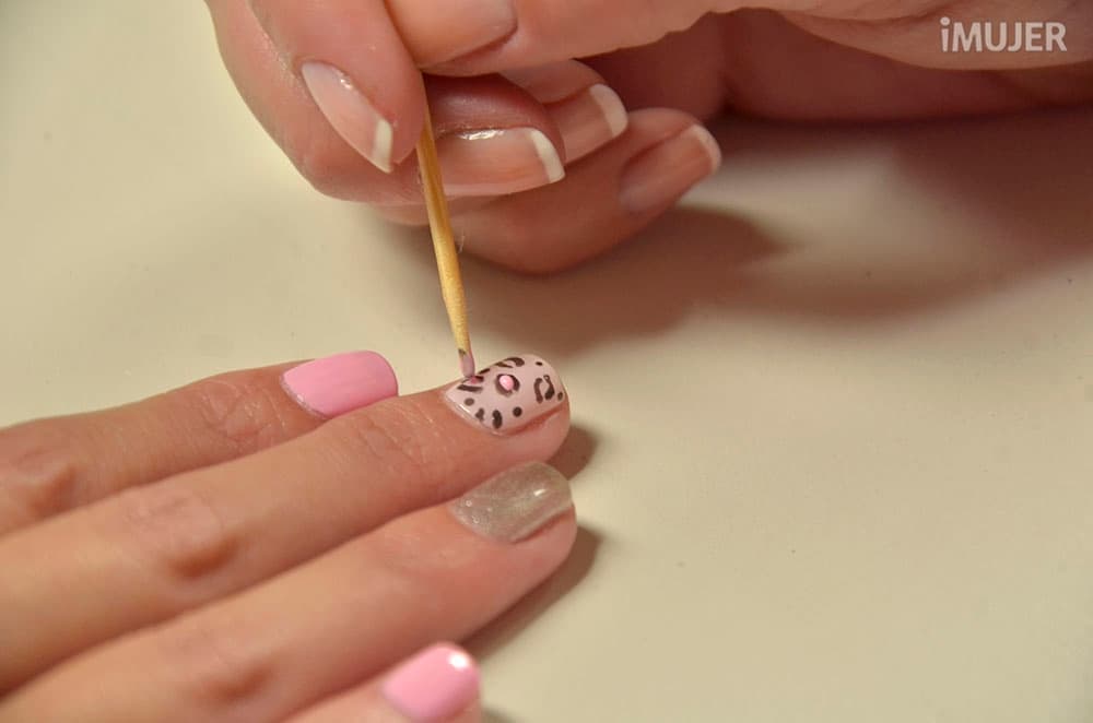 Pero, ¡esto no es todo! De hecho, falta la parte más desafiante: el animal print. Concéntrate, porque para tener éxito necesitarás todo tu pulso. Con la ayuda del escarbadientes mojado en el esmalte gris, dibuja el contorno de las manchas del leopardo en tu uña mayor, tal como lo muestra la imagen.