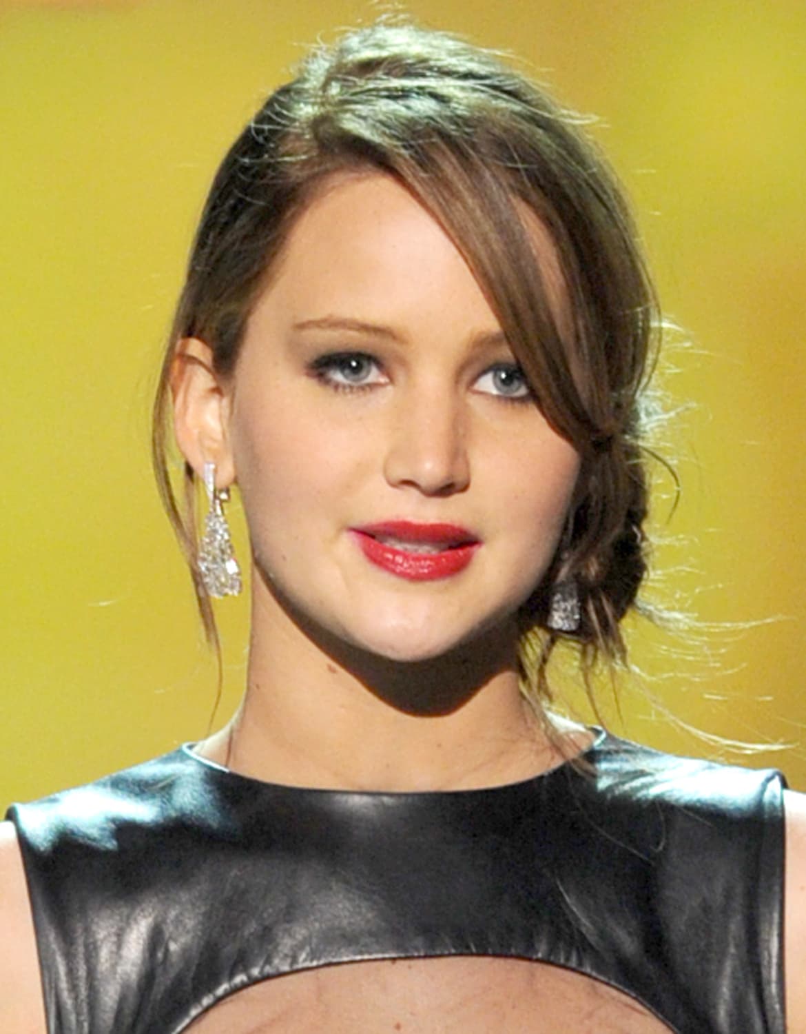 Jennifer Lawrence luce el flequillo bastante largo y hacia un costado.