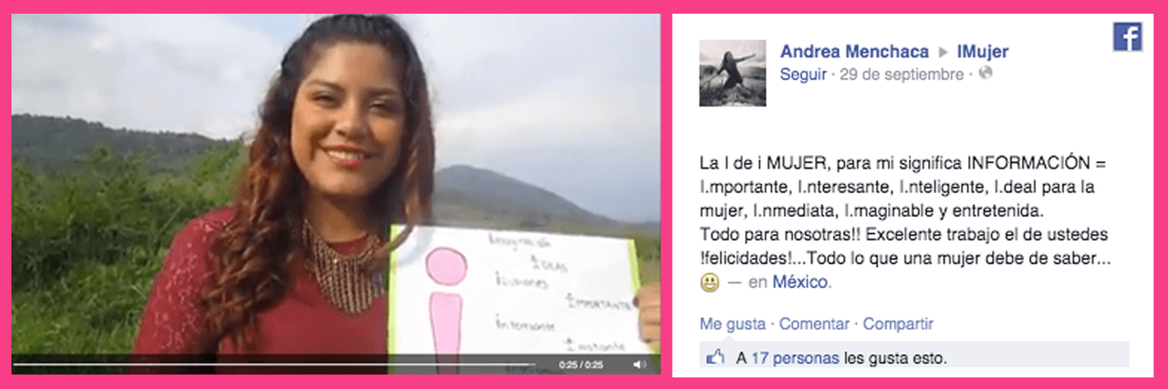 Aquí les traemos el video que Andrea nos envió y donde nos contaba qué significa la i de iMujer para ella, junto con una captura de su publicación en nuestra fan page.