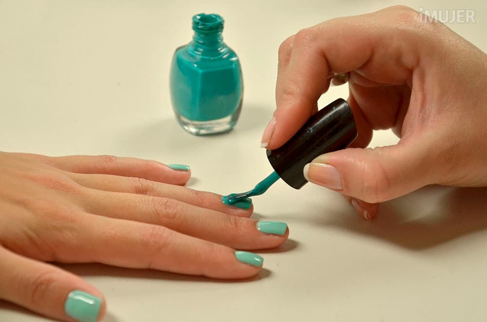 Píntalas todas -salvo las anulares- con el esmalte verde agua.