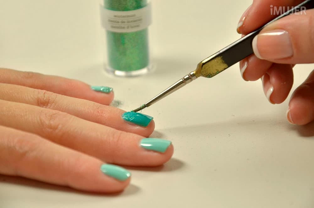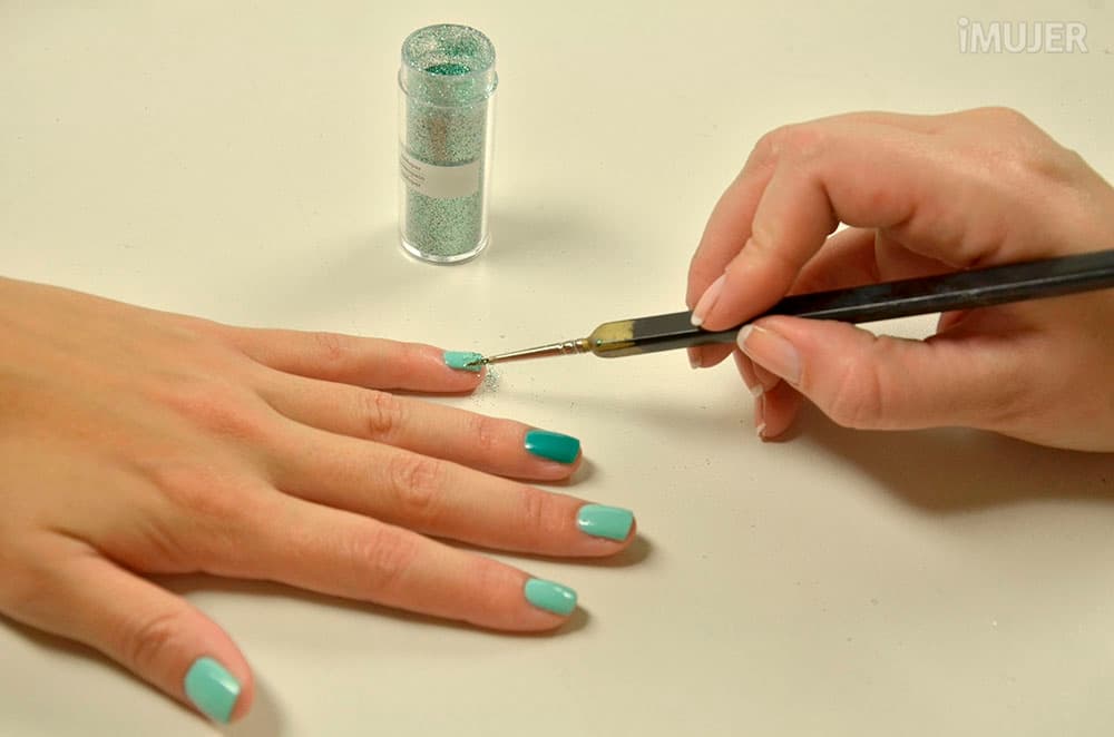 Toma la purpurina turquesa y repite el procedimiento que acabas de realizar con las uñas anulares.
