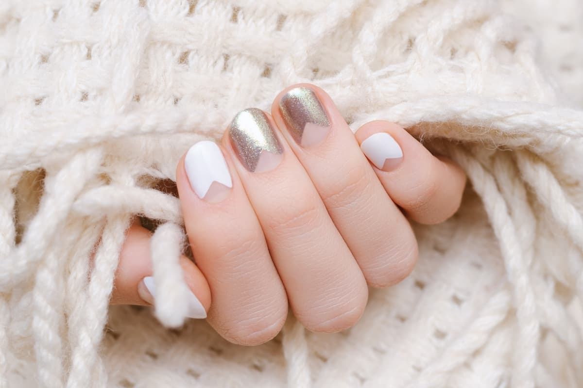 Consiste en pintar la mayoría de tus uñas (3 o 4 en cada mano) con un mismo color y resaltar las demás con un esmalte de brillitos. También puedes crear líneas con ese barniz.
