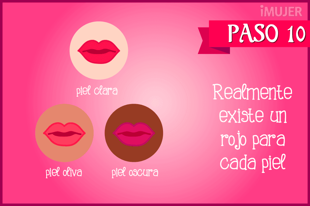 El rojo es el labial más clásico y trendy. Pero tiene varios tonos y para elegir el adecuado debes tener en cuenta tu tipo de piel. Si eres de piel clara, debes elegir un labial con un tono de base azul-rojo mientras que para piel oliva es mejor un tono de base naranja-rojo. Si tienes un tono de piel oscura opta por un labial bordó.