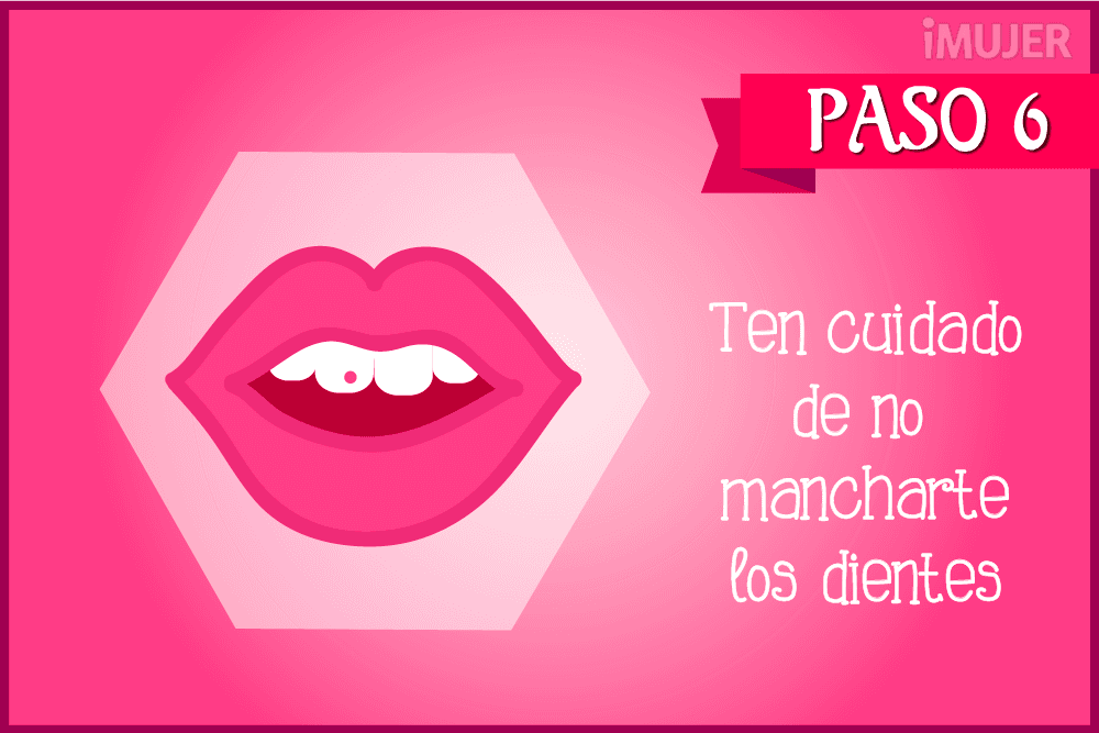 Luego de aplicar el labial, coloca el dedo índice en tu boca y cierra suavemente tus labios, luego retira rápidamente. Este movimiento sacará el labial que quede dentro de tus labios para evitar que tus dientes se manchen.