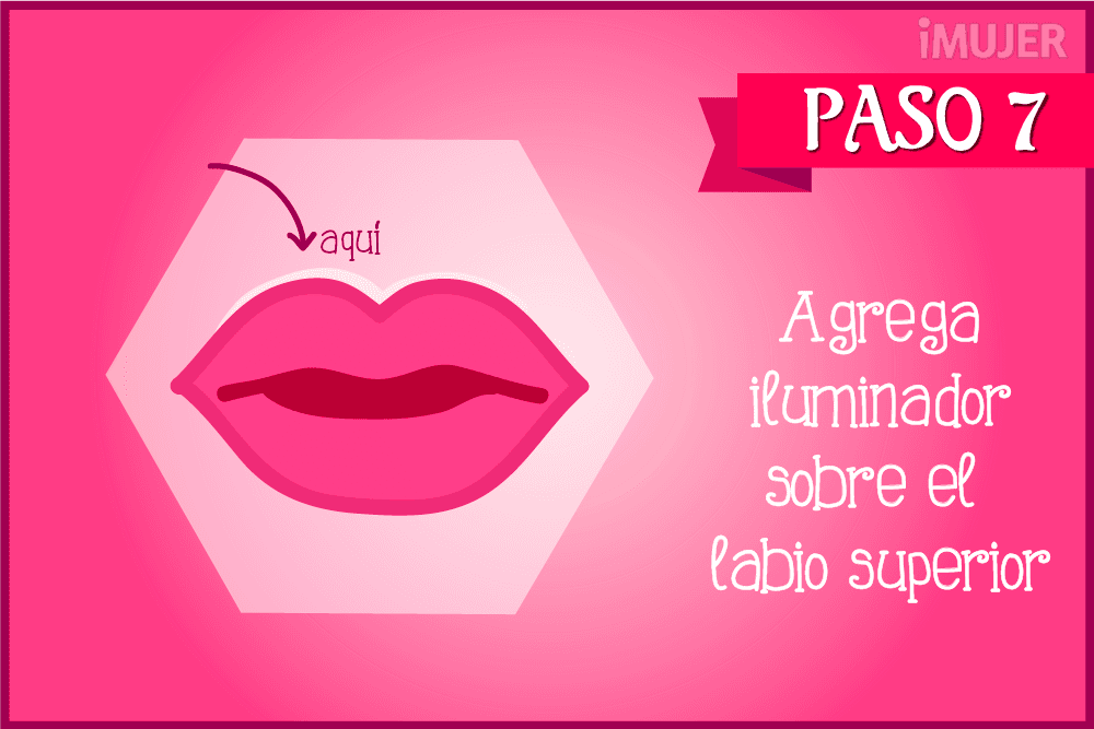 Agrega iluminador en el labio superior, en la zona conocida como el arco de cupido, lo que hará que las partículas que reflejan luz centren la atención en esa parte de tus labios. También puedes usar un corrector cremoso en la misma zona para definir mejor los labios.