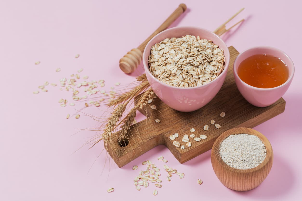 La avena contiene componentes antiinflamatorios y antioxidantes, además de retener la humedad en la piel, complementando las propiedades regenerativas de la miel.