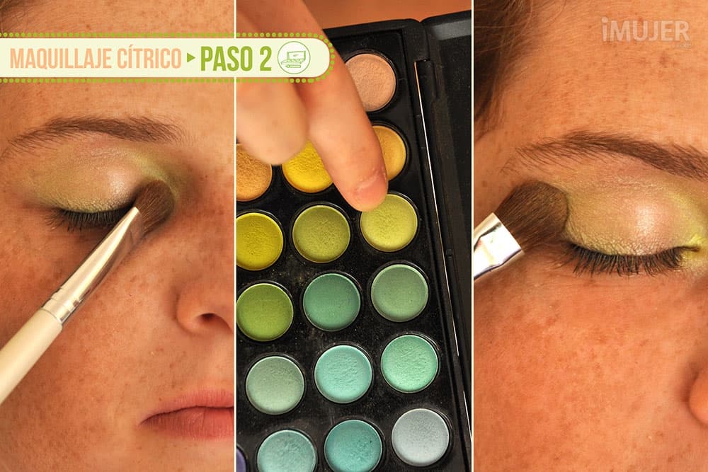 El primer paso es aplicar una sombra de ojos de un color entre amarillo y verde sobre el párpado móvil.