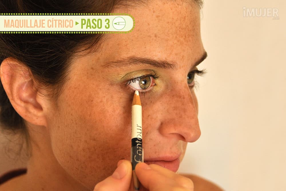 Ahora delineo con delineador blanco la línea de agua del ojo. En esta ocasión, no uso el delineador negro porque contrasta demasiado con lo vibrante que se ven los colores cítricos.