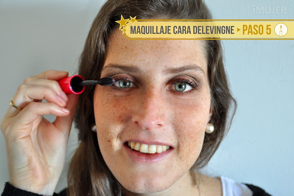 Y termino el maquillaje de ojos de Cara Delevingne con máscara en las pestañas superiores.