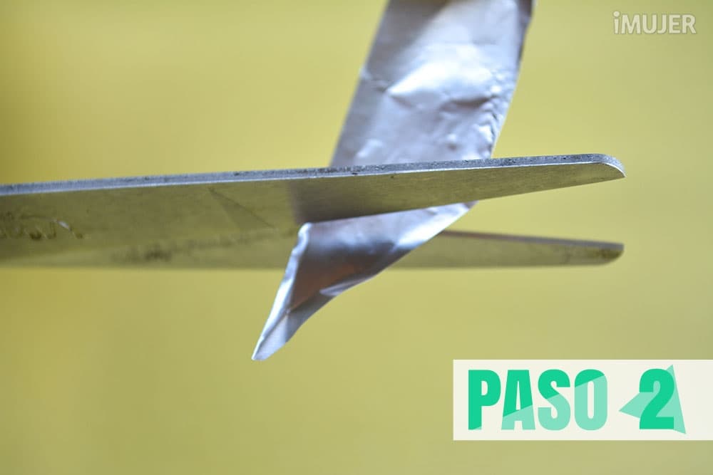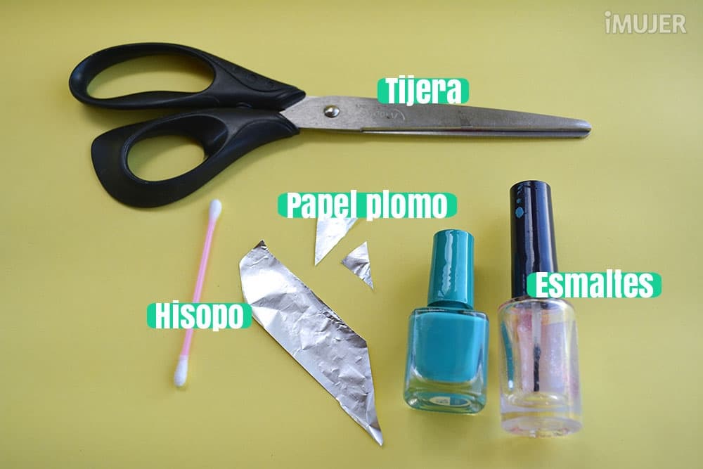 Ahora, toma el papel de plomo, corta una tira, y luego un triángulo tal como lo muestra la imagen. A continuación, con la ayuda del hisopo presiona el triángulo sobre el esmalte fresco.