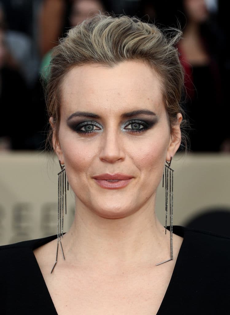 La protagonista de Orange is the New Black llevó sombras plateadas y negras para su cat eye. Para sus labios llevó un rosa muy tenue.