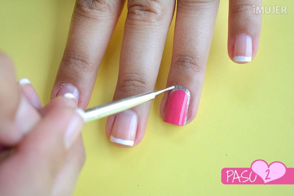 Para continuar, y solo una vez que se haya secado la primera capa de esmalte, moja el punzón en el esmalte plateado y con sumo cuidado bordea el extremo inferior de tu uña.