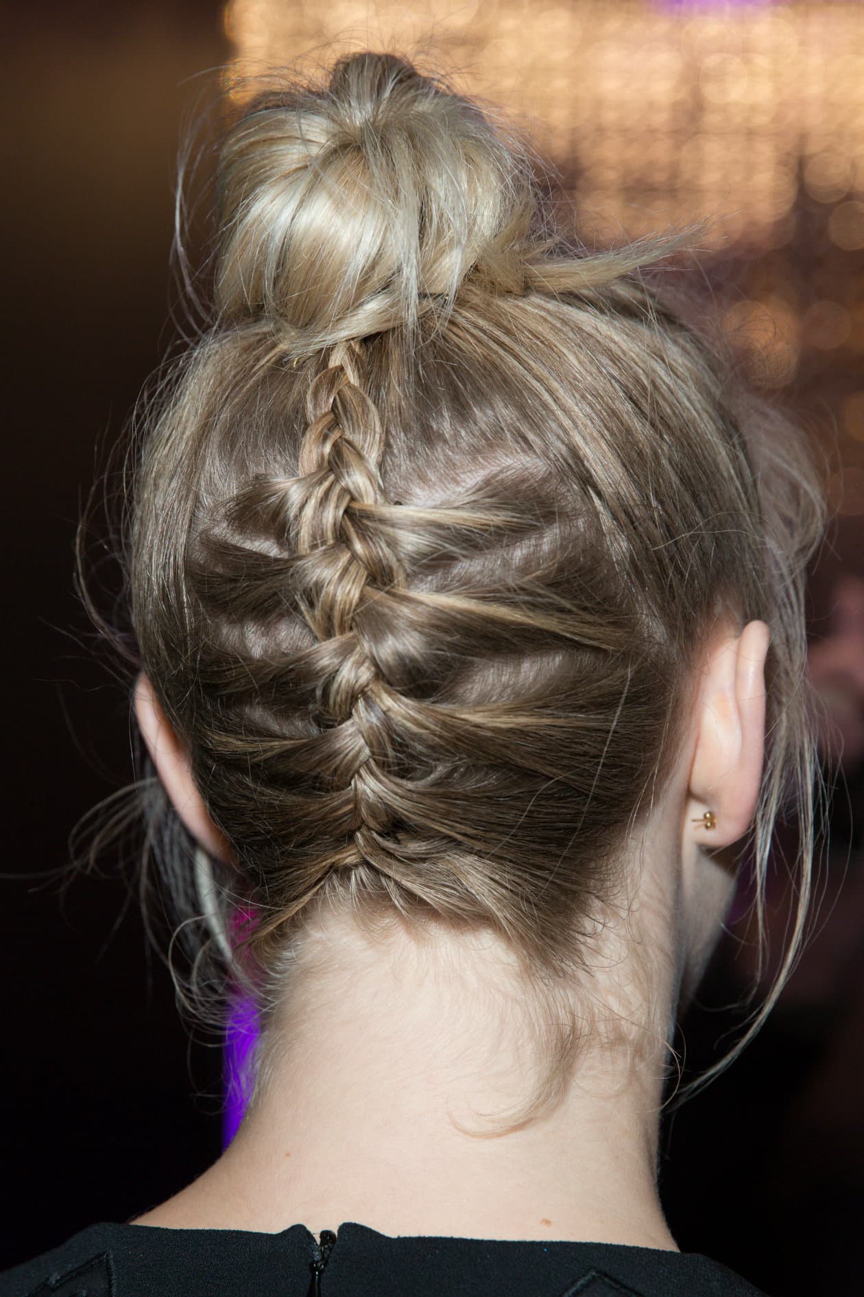Como bien dijimos, los moños despeinados están de moda. Prueba a hacerte un moño alto despeinado, pero con el detalle de una trenza cocida en la coronilla. ¿Cómo? Lleva todo tu cabello hacia adelante, y comienza a hacer la trenza cocida como la harías en las raíces, pero partiendo de la nuca hasta la altura en que irá el moño. Cuidado, la postura puede marearte un poco. Luego, recoges todo el resto del cabello y haces el moño rápido, con tan solo una goma de cabello y algunas horquillas.
