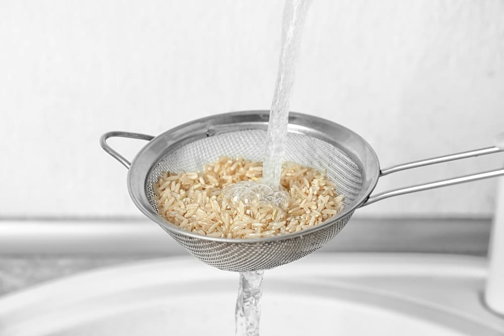 Pon el arroz en un colador y enjuágalo hasta que el agua salga más transparente que blanca. Una vez limpio, vacía en un recipiente, cubre con agua y deja reposar toda la noche.