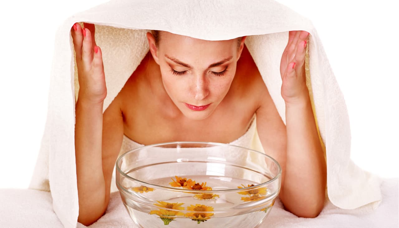 Después, calienta un poco de agua y colócate una toalla encima de la cabeza. Acerca tu cara al vapor que despide el agua, esto ayudará a abrir los poros. Ten mucho cuidado, el vapor no debe quemarte.