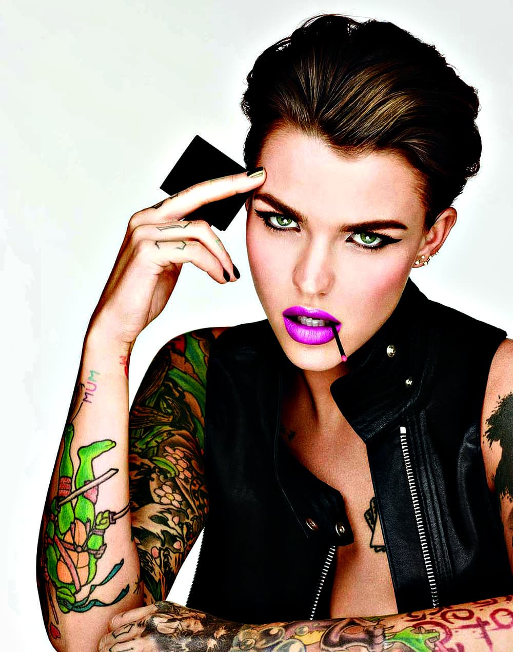 Ahora, Ruby Rose esta realizada y lleva su belleza al límite. Los diseños de sus tatuajes son tan originales como los colores que ofrece la marca de belleza. Y, coinciden en tener un punto femenino, peligroso y divertido. Rose tiene más de 60 tatuajes en su cuerpo. Frases como “Just Love”, “Let go, let go”, y palabras como “Life” decoran su piel. Además tiene el dibujo de la Tortuga Ninja Leonardo, Astroboy, un tigre, una llave, entre otros.