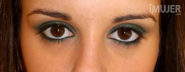 Con un lápiz negro, delinearemos la línea inferior y superior interna del ojo, y aplicaremos sombra verde con la ayuda de un pincel plano.