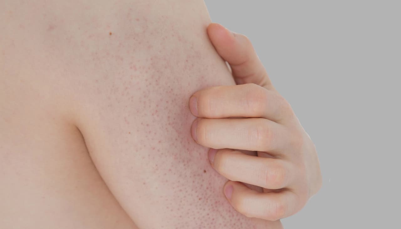 Dicha acumulación de queratina –y células muertas, según la AAD– obstruye la abertura de los folículos con un tapón escamoso y así se presentan estas zonas de piel áspera y granos.