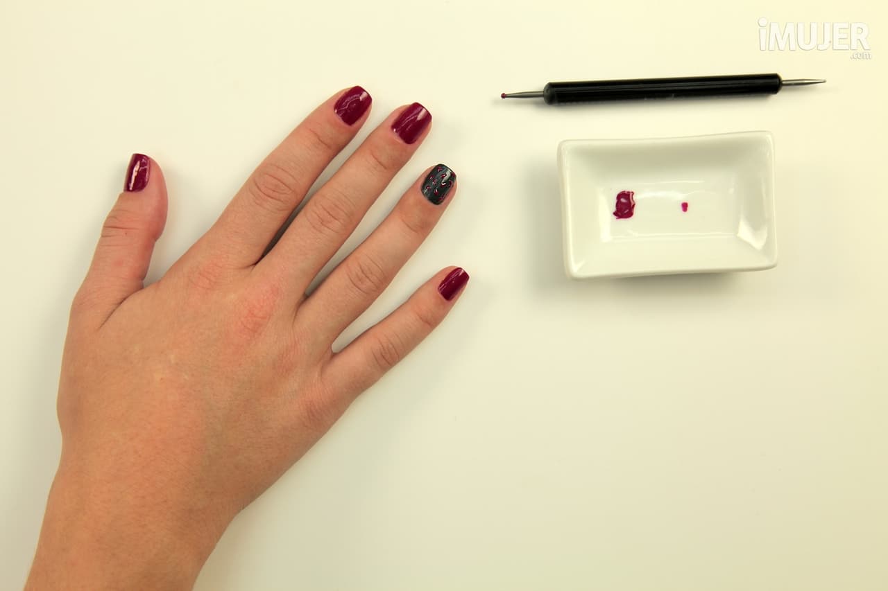 Con cuidado presiona el punzón en tu uña gris y dibuja varias pequeñas manchitas.