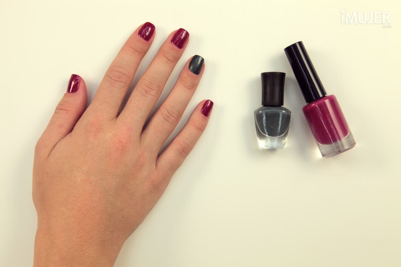 Píntate cuatro uñas de morado y la uña restante con el esmalte gris. Da dos manos de esmalte para que el color se adhiera mejor.