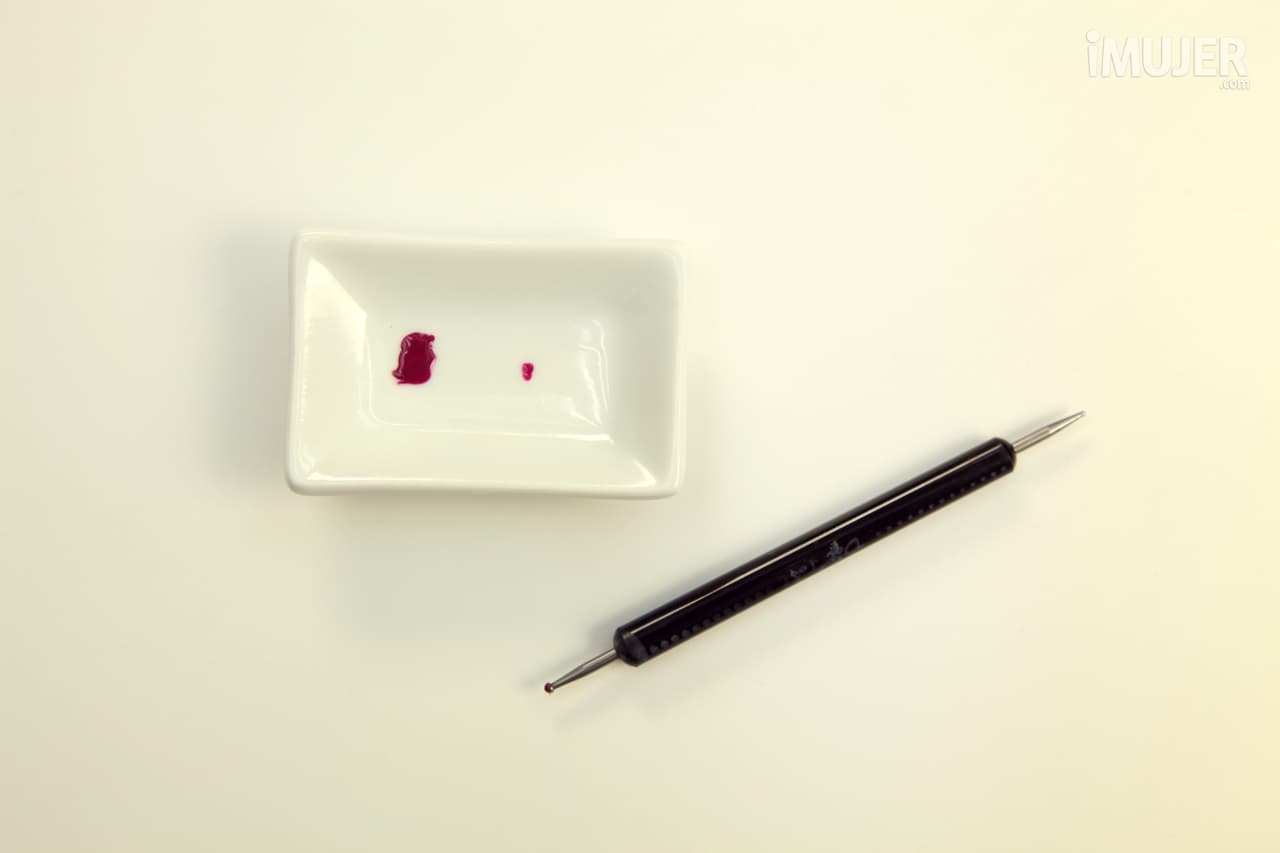 Coloca un poco de esmalte morado en el plato y moja la punta del punzón.