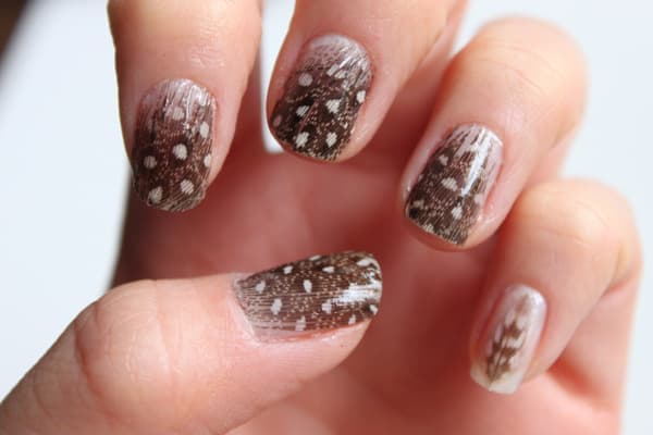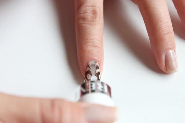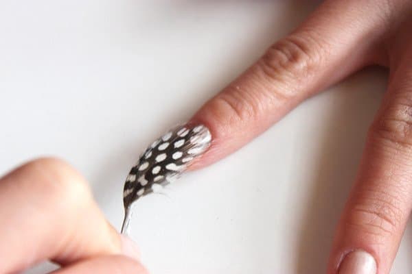 Toma una pluma pequeña y arrástrala sobre el esmalte como puede apreciarse en la imagen. Parte de su diseño quedará impregnado en la uña inmediatamente.