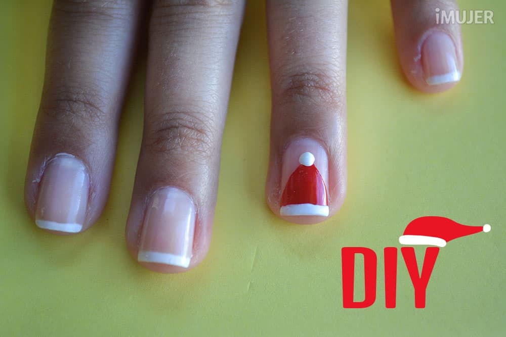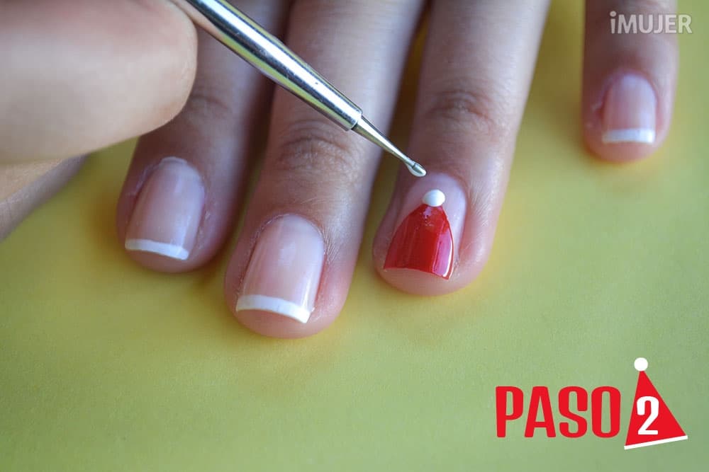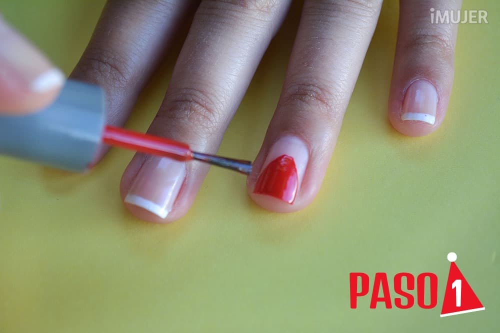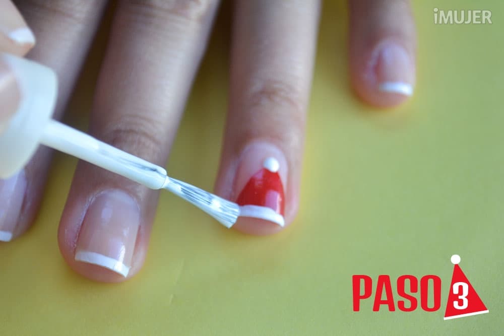 Luego de haber pintado tus uñas al mejor estilo francés, deberás centrarte en el gorrito de Santa. Dibújalo con el esmalte rojo, tal como lo muestra la imagen.