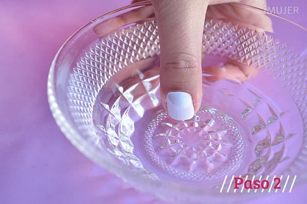 Deja pasar unos minutos –de modo que el esmalte no esté del todo fresco, pero tampoco seco– e introduce una uña en el recipiente con alcohol.