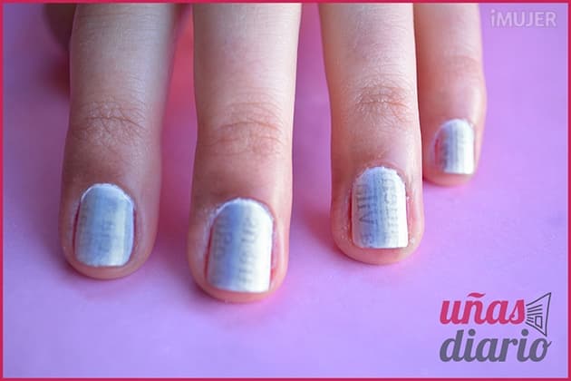 A continuación, aplica el papel de diario sobre tu uña y presiónalo levemente. Una vez que lo remuevas, las letras del diario tendrán que haber quedado plasmadas en tu uña.