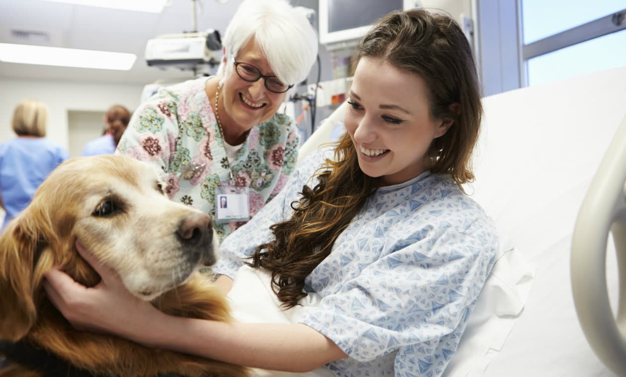 En muchos hospitales de recuperación no es extraño ver algún perro rondando por ahí para ayudar a su dueño a recuperarse. Los perros pueden ayudar a la movilidad, el contacto personal y la socialización entre los pacientes. Son muy buenos para aliviar los sentimientos de soledad, en especial son ideales para los pacientes más ancianos.