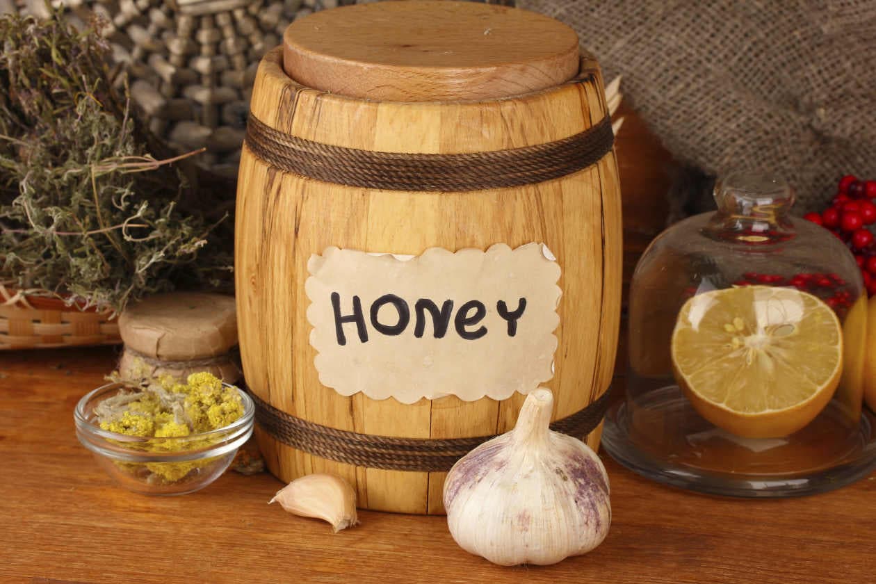 Prepara un eficaz remedio casero para el dolor de garganta con tres cabezas de ajo peladas y miel como para llenar un frasco. Coloca todo junto en un recipiente y guárdalo en el refrigerador. A la primera señal de dolor de garganta come un diente de ajo por hora, disminuyendo la cantidad a medida que notas alivio.