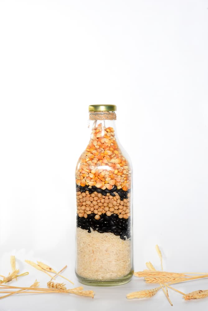 - Granos crudos de arroz, frijol, maíz, lentejas; los suficientes para llenar la mitad del recipiente