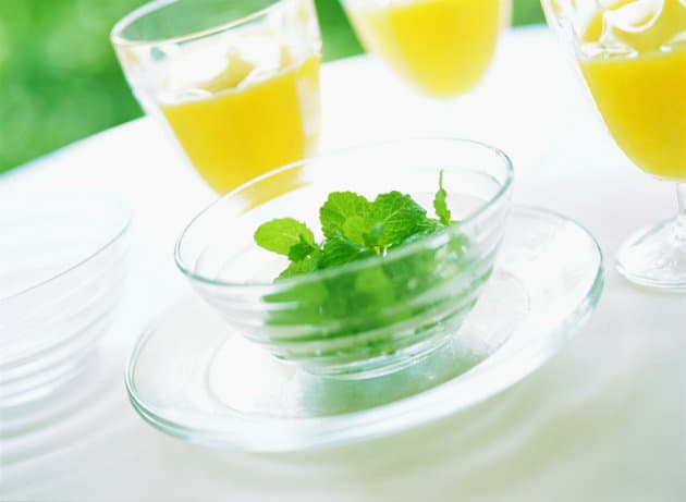 Pela las naranja y exprime su jugo. En una licuadora mezcla el jugo con la menta, agrega hielo y miel si las naranjas no están muy dulces.
